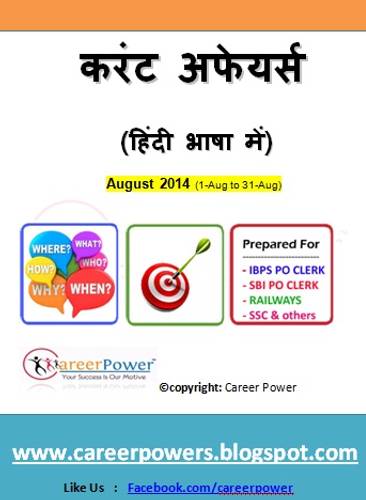 As so many request of our readers, Current Affairs August 2014 is available in Hindi. From now We will upload every month Current affairs in Both Hindi and English version.